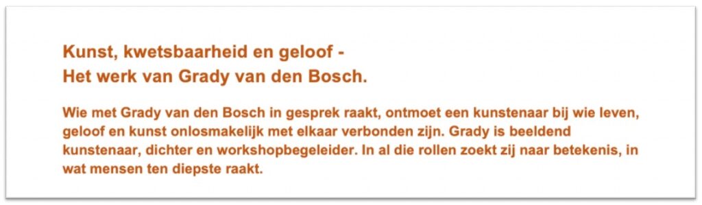 In mijn kunst, kunsteducatie en poëzie, herken je veelal thema’s rond zingeving, filosofie en religie.